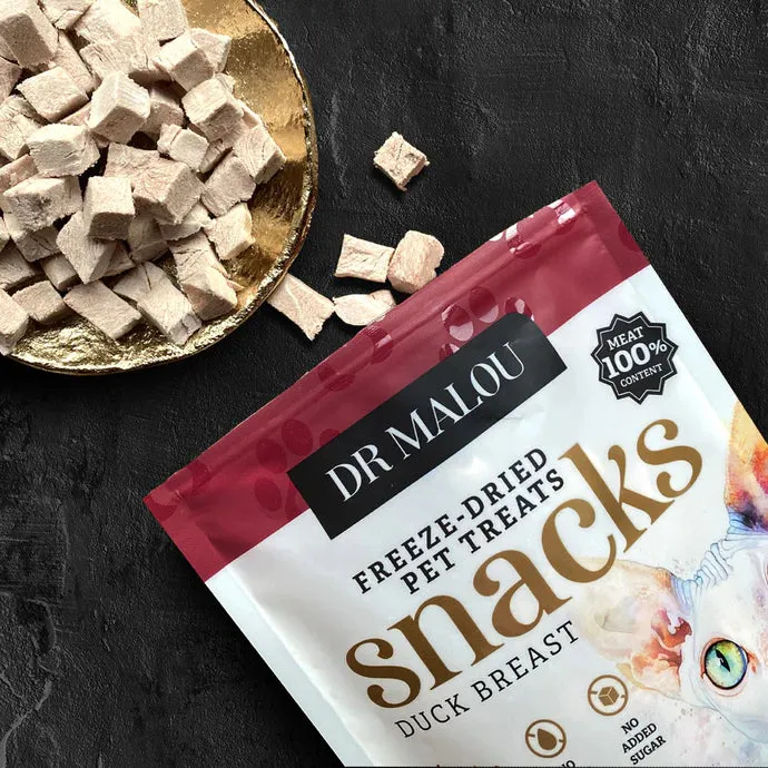 Kostki mięsne Dr Malou to luksusowa przekąska dla kota, przygotowana w 100% z liofilizowanej piersi kaczki. Proces liofilizacji pozwala na zachowanie naturalnej struktury mięsa, jego głębokiego aromatu oraz niemal wszystkich wartości odżywczych, bez konieczności stosowania wysokich temperatur czy sztucznych konserwantów.